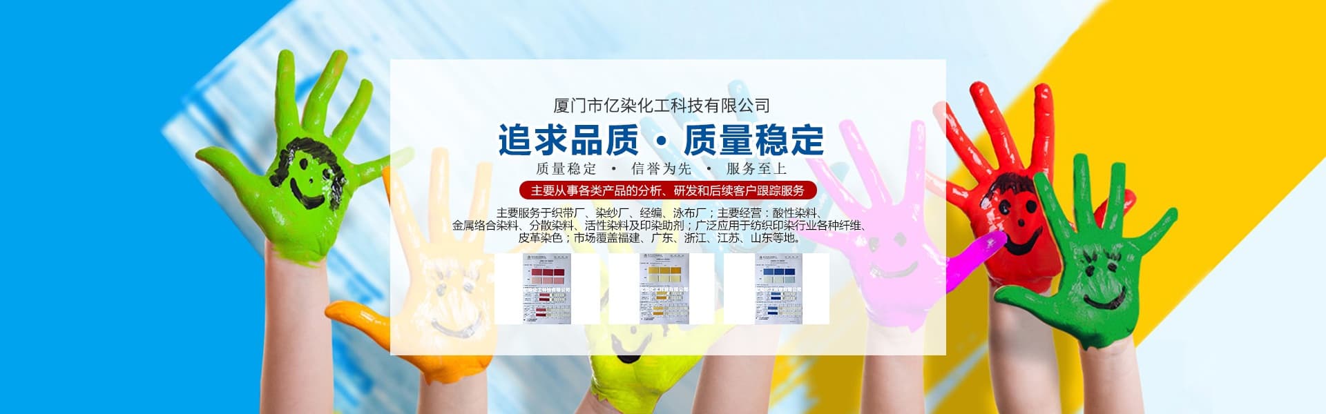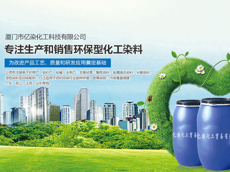 廈門市億染化工科技有限公司是一家集研發(fā)、生產、銷售一體的綜合型企業(yè)。公司主要經營:酸性染料、金屬絡合染料、高牢度分散染料及印染助劑。公司信守“以誠信贏合作、以質量贏市場、以創(chuàng)新贏發(fā)展、以服務贏生存”的企業(yè)精神服務于廣大客戶,多年以來建立了良好的市場口碑,市場遍布福建、廣東、浙江、江蘇、山東及東南亞國家,與多家知名企業(yè)建立了長期合作伙伴關系!